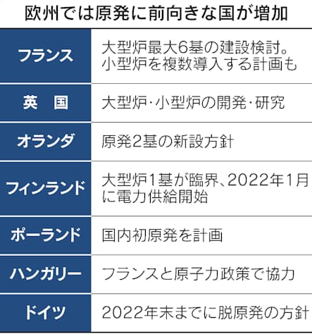 マクロン仏大統領は11月、国内で原発の建設を再開すると表明し、英国も大型炉の建設を進める。両国は次世代の小型炉の開発にも力を入れる。オランダは12月半ば、総額50億ユーロ(約6500億円)を投じる、原発2基の新設計画をまとめた。
