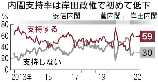 岸田文雄内閣の支持率は59%で2021年12月の前回調査から6ポイント低下した。21年10月に岸田政権が発足してから初めて下がった。「支持しない」と答えた割合は30%で4ポイント上昇した。