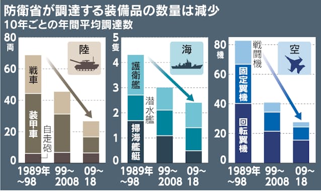防衛省によると陸上自衛隊は1989~98年に大砲を積んだ自走砲や装甲車、戦車を年平均68.6両調達していた。09~18年は26.6両にしぼんだ。海上自衛隊の掃海艦艇や護衛艦、航空自衛隊のヘリコプターや戦闘機も減った。