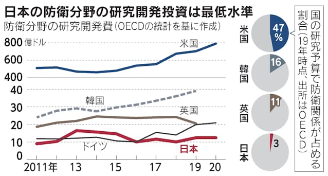 防衛省幹部は「米国は10年先の脅威を見据えて装備開発に着手する。世界に売れる技術で企業はもうかってさらに投資する」と分析する。日本は研究開発費の防衛分野の比率が3%と低い。韓国の16%、英国の11%に見劣りする。